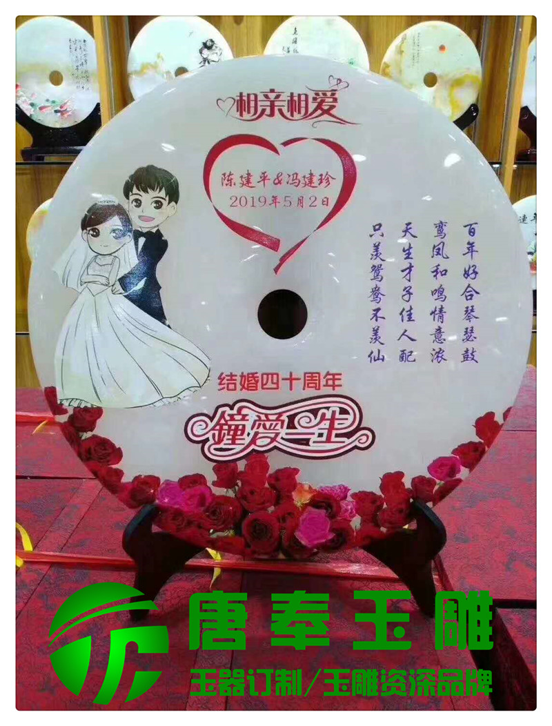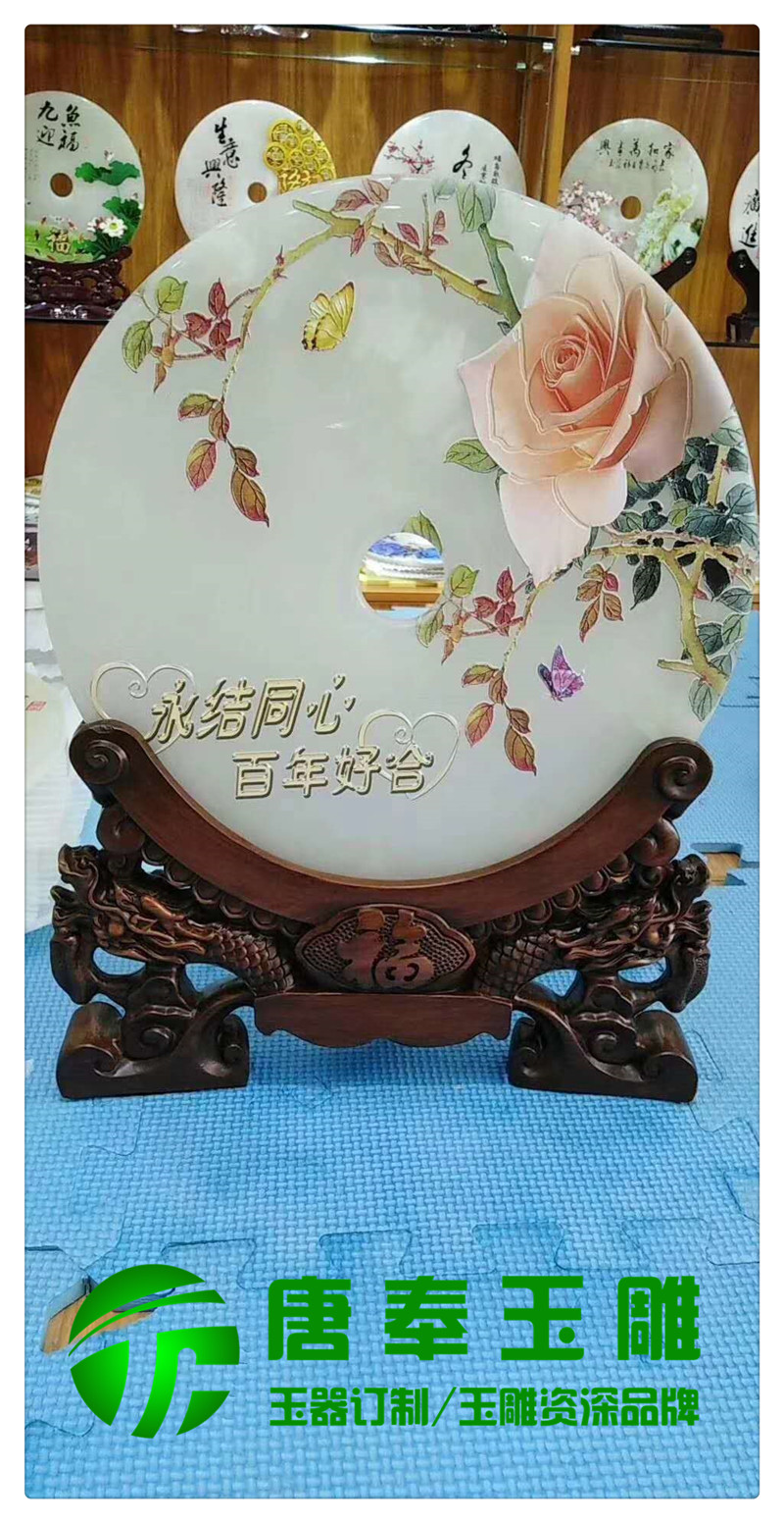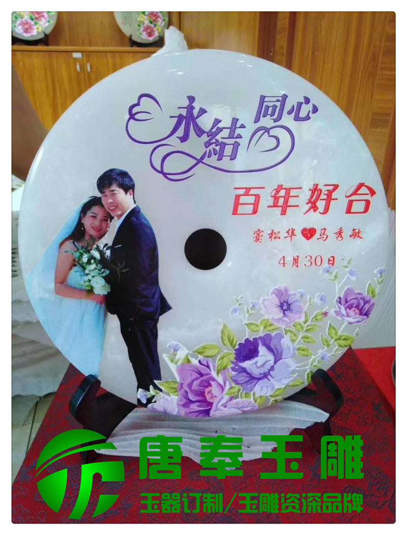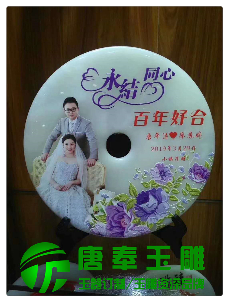 結(jié)婚紀念浮雕圖案玉平安扣用于竣工開業(yè)、周年紀念、畢業(yè)紀念、結(jié)婚紀念等地方,浮雕圖案,公司logo,刻字等,既有品位又有收藏價值。